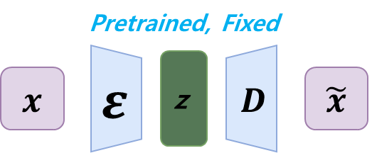 첫번째로 위와 같이 auto-encoder 구조로 모든 이미지에 대해 perceptual 정보를 잘 압축하는 모델을 사전학습시킨 뒤, 고정한다. 이 모델은 CNN 기반으로 latent variable, z 는 spatial information을 그대로 들고 있는 형태로 맵핑된다.