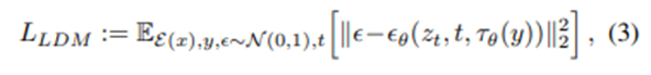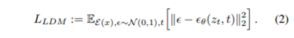 loss 또한 기존 diffusion model이 사용한 수식과 동일하지만 이미지 입력 x가 아닌 latent 입력 z가 사용된다는 차이가 있다.