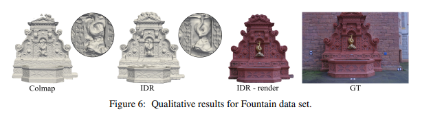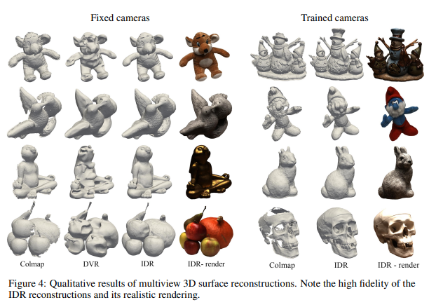 따라서 volume density 갖고 있는 3D geometry 정보는 강화하면서 색깔에 기여하는 역할은 보존하는 방법을 이 논문에서는 소개한다. 결과적으로 NeRF인데 3D geometry가 정확하게 나오는 NeRF 를 만드는 논문이다. 실제로 본 제목보단 Implicit differentiable renderer 라는 이름으로 IDR로 많이 불리는 논문이다.
