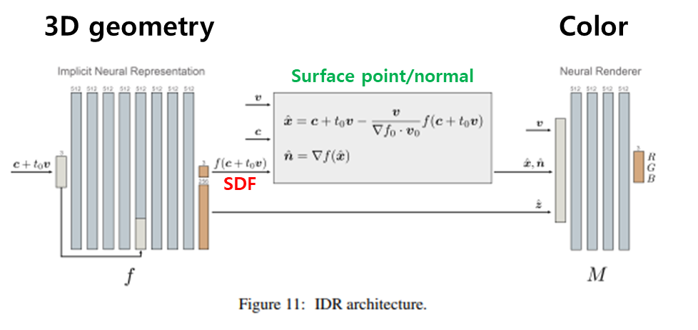 NeRF가 한 뭉치의 MLP로 끝이었다면 IDR은 둘로 나누어 3D geometry를 전담하는 전반부와 color를 전담하는 후반부로 나누어 설계되어 있다. (그래서 논문 제목에 disentangle이라는 단어가 들어가 있는 것이다.) 전반부는 SDF(signed distance function)을 추정하는 네트워크로 설계했고 후반부는 light field를 추정하는 네트워크로 설계되어 있다.