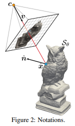 surface point는 특정 위치의 SDF값을 알고 있기 때문에 아주 쉽게 구할 수 있다. SDF의 의미 자체가 표면으로 떨어진 거리(부호 포함) 이기 때문에 어떤 위치 (c+tv) 에서 해당 SDF 만큼 이동해주면 표면에 다다를 수 있다. 이 때 SDF가 떨어진 거리만을 의미할 뿐 방향은 외부/내부 수준으로 밖에 못 알려주기 때문에 SDF의 gradient를 이용하여 표면까지 방향을 추정하고 이동한다. 이게 수식(3)의 의미다.