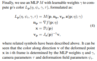 위 방식으로 3D point, p를 선별했다면 이 p의 normal, position, feature 다 MLP에 때려넣고 대응되는 pixel color와 맞도록 학습을 시키면 된다. gradient를 강제로 흐르게 하는 과정에서 deformation field도 엮이기 때문에 앞의 Non-rigid deformation MLP도 같이 학습된다.