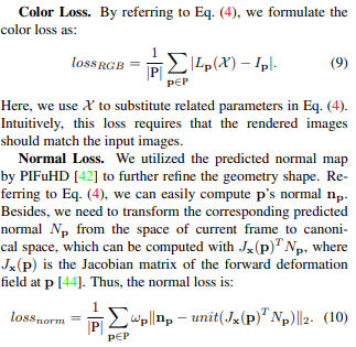 직접 2D supervision을 제공하는 부분은 똑같다. pixel color가 결과 color와 같아야 한다는 L1 단순한 loss이며 PiFuHD로 normal을 구해뒀기 때문에 normal도 loss로 추가해준다.