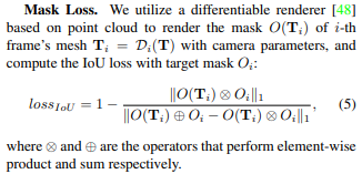 각 프레임의 사람 마스크도 같이 있을 경우, 중간에 point 찾느라 만든 mesh를 이용해서 mask loss를 먹인다. 실루엣이 GT 마스크와 맞아떨어지도록 IoU loss가 추가된다.