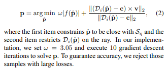 궁여지책으로 현재까지 학습된 f를 이용해 marching cube를 이용해 표면을 강제로 만들고 그 표면과 ray가 부딪히는 위치를 sampling해서 사용하는 방법을 사용하게 되었다. 래퍼런스 프레임에서 표면 point는 p, 기타 프레임에서 표면 point는 x라고 정의했다.