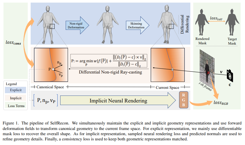 이 논문은 SMPL + NeRF 컨셉을 이용해서 3D Human reconstruction을 목표로 하는 논문이다. NeRF 컨셉을 녹인 것이기 때문에 결과물로 나오는 3D Human mesh는 SMPL류도 아니고 rigging이 가능한 형태도 아닌 그냥 mesh 덩어리다. 그냥 입력 데이터에 딱 맞는 덩어리가 나오는 논문이다. contribution 자체가 explicit method (SMPL 기반) 과 implicit method (SDF + NeRF) 를 합친 것에 있다.