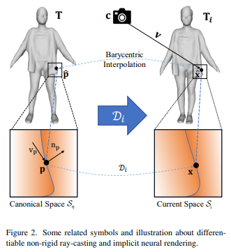 먼저 Deformation field란 다음과 같다. 사람은 물체처럼 형상이 가만히 있는 물체가 아니기 때문에 multi-view contraints를 쓰더라도 3D recon이 쉽지 않다. 따라서 카메라가 움직여서 발생한 움직임이 아닌, 사람이 움직여서 발생한 움직임을 동시에 이용해야 한다. 그 사람이 움직인 것을 vector로 표시한 것이 deformation field다. 사람 표면의 한 점 p가 있다고 했을 때, 자세0의 p 위치에서 자세 1의 p위치를 가리키는 vector 라고 생각하면 된다.