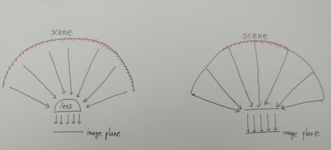 왼쪽 그림처럼 광각 카메라의 경우, 광각 렌즈에 의해 scene으로부터 온 빛이 모이고 이 빛이 image plane에 찍혀 이미지가 된다. image plane은 평면인데 빛은 평면이 담을 수 있는 영역보다 넓은 곳에서 모이기 때문에 꾸역꾸역 우겨넣으려다 보니 왜곡이 생기는 상황이라고 볼 수 있다.