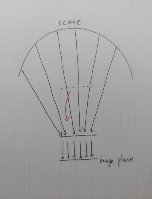 왜곡을 펴는 것 까지 동일하고, 원래 image plane 위치 (점선)을 조금 더 뒤로( focal length를 짧게) 옮기면 평면 image plane으로 원래 scene에서 오는 빛을 그대로 받을 수 있다.