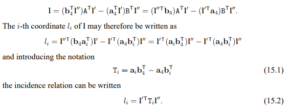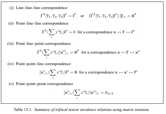 이는 조합 순서를 바꾸면 3가지가 존재하기 때문에 3x3 * 3개가 존재하게 되고 tensor 형태가 된다. 그리고 이 T matrix 3개가 하나로 묶여 trifocal tensor라고 불리는 것이다.