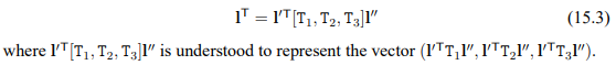 그러면 3D line, L은 각 평면 π, π', π'' 위에 있으므로 당연히 위 수식을 만족할테고 M = [π, π', π''] 라고 정의한다면 다음과 같이 현 상태를 정리할 수 있다. 그리고 바로 이것을 변형하면 trifocal tensor가 등장한다.