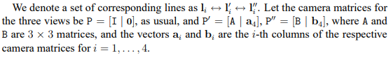 이 때 각 카메라 센터 C, C', C''은 알고 있다고 가정하고 각각 P=[I|0], P'=[A|a4], P''=[B|b4]와 같이 intrinsic, rotation, translation을 알고 있는 상태다.