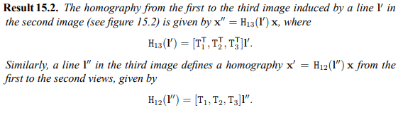 정확히 어떤 homography matrix로 표현되는지 따져보면 trifocal tensor의 transpose들과 l'을 dot product한 결과로 나오는 3x3 matrix가 된다. 당연히 l을 알고 있을 때, l''을 알고 있을 때도 있기 때문에 3가지 homography가 존재한다.