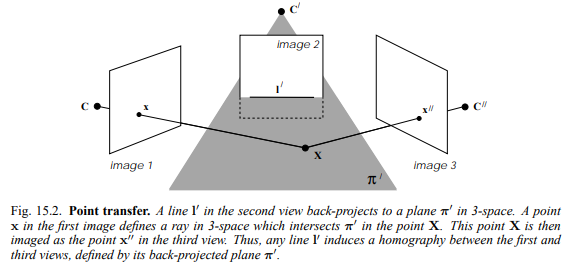 위 설명과 마찬가지로 l' 을 back-projection함으로써 평면 π' 을 만들 수 있는데 이 때 trifocal geometry를 만족하는 점이라면 image 1의 점 x가 image3의 점 x''로 어떻게 바뀌는지 알 수 있다. 반드시 π'과 교차하기 때문에 homography를 이용해서 계산할 수 있게 되기 때문이다.