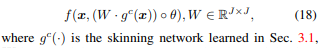 하나의 팁은, 그냥 point, x만 던져주니 학습이 좀 더뎠고 x가 신체 어느 부위인지 정보를 같이 넣어주니 효과적이었다고 한다. 단순히 fitted SMPL pose parameter를 넣어주는 방식으론 부족해서 W라는 weight matrix를 이용해 x가 해당하는 신체 부위의 SMPL 파라미터만 같이 넣어주어 사용했다고 한다.