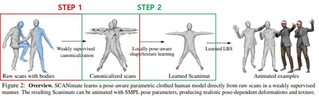 논문은 크게 두 단계로 나뉘며, 첫번째는 Scan sequence 하나 하나마다 canonical pose, 즉 기본 자세로 unpose하는 단계이고 두번째는 unposed scan sequence를 모두 다 합쳐 하나의 아바타로 만드는 단계이다.