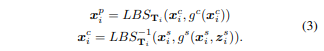 대략의 컨셉은 3D scan point cloud 중 한 point를 잡고 이 point에 해당하는 skinning weight를 계산하는 것인데 다른 말로 forward와 backward, LBS weight와 inverse LBS weight를 찾으면 되는 문제라고 정의했다. skinning weight와 동시에 필요한 joint와 joint transformation을 SMPL 것을 사용한다.
