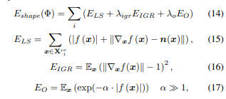 학습 효율성을 높이기 위해 (16)과 같은 eikonal loss나 (17)과 같은 표면 외 위치에서의 값을 억누르는 regularization term을 추가해두었다.
