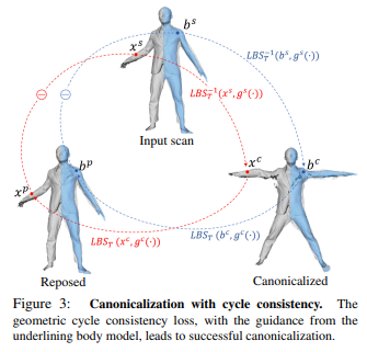 그리곤 3D scan의 한 point를 unpose(inverse LBS)해서 canonical space로 옮긴 뒤 이를 다시 pose(LBS)했을 때 제자리로 가야한다는 cyclic consistency를 이용해 LBS와 inverse LBS를 하나의 loss function으로 묶어 학습한다.