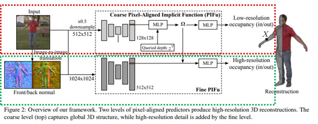 위 그림 중 빨간 박스에 해당하는 low-resolution 파트는 PiFU와 완전 동일하다. front/back normal 이미지를 low resolution으로도 만들어 추가 입력으로 넣어주었다는 차이만 있을 뿐 네트워크 디테일은 완전히 같다.