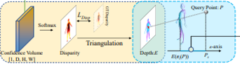 세번째 입력은 진짜 depth다. 스테레오 세팅이다 보니 좌우 disparity를 구하면 depth를 얻어낼 수 있는데 이를 이용하여 human front depth를 먼저 얻고 시작하는 것이다. AANet+를 이용하여 사람의 front depth를 추정한다. 동시에 dispairty 별 confidence도 예측하도록 한다.