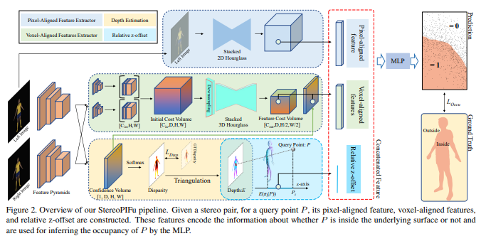 전체 흐름은 3가지 입력 준비 -> occupancy MLP 학습으로 이루어진다. 3가지 입력은 각각 pixel aligned feature, voxel aligned feature, relative depth이다. pixel aligned feature를 PiFU와 동일하다.