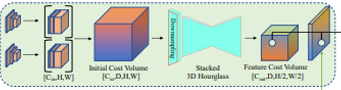 이렇게 만들어진 initial cost volume을 3D stacked hourglass network를 통과시켜 최종 feature volume으로 만든다. 이 volume 상의 한 voxel을 공간 상의 한 3D 위치 정보를 encoding하고 있다고 볼 수 있고 voxel aligned feature 역할을 한다.