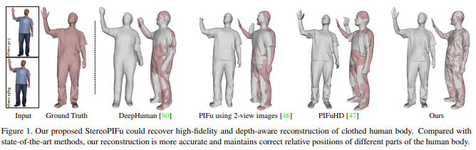 제목 그대로다. PiFU가 좋은 성능을 보여줬다고 한들 single view이기 때문에 문제가 많다. 애초에 depth ambiguity 때문에 풀 수 없는 것이 single view 3D reconsturction인데 이를 데이터에 의존해서 풀어낸 것이기 때문에 분명 한계가 있는 방법이다. 해결 방법은 multiview 정보를 쓰는 것 뿐인데 이 논문은 그 multiview를 two view로 한정해서 푼 논문이다. two view, 즉 stereo는 아직까지 타협할 수 있는 정도의 카메라 세팅이기 때문에 좋은 접근이라고 생각했다.