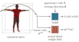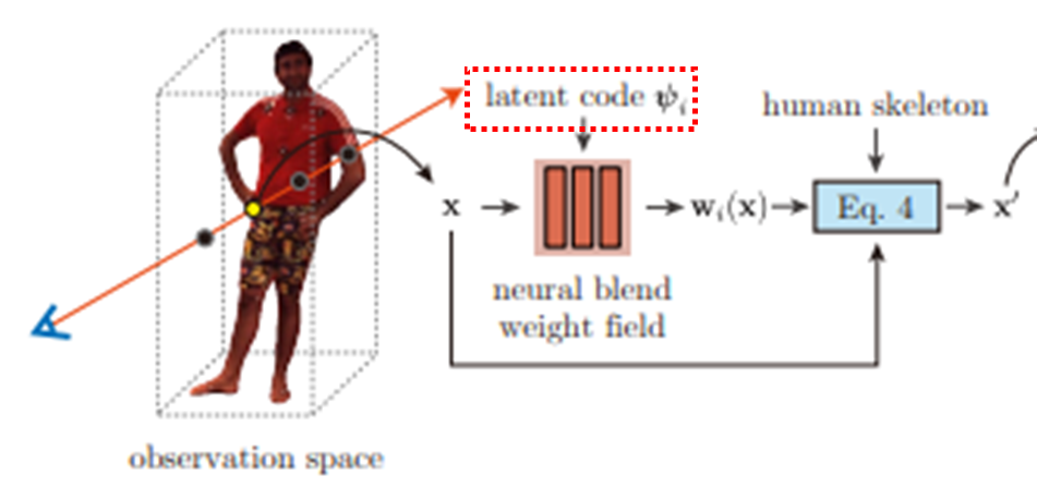 각 프레임 이미지 마다 latent code(learnable)를 부여하고 이미지 ray 상 point, x와 함께 neural blend weight field network를 통과시킨다. 결과로 나오는 w(x)는 LBS에 필요한 skinning weight가 나온다.