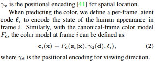 appearance code, l은 이미지 별 latent code와 마찬가지로 learnable code인데 같은 대상이라도 time, t가 다르므로 발생하는 색의 질감 차이, 빛의 차이를 커버하기 위해 추가된 code다.