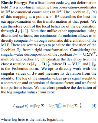 자르기가 어려워 통째로 가져왔는데, 요약하자면 deformation field가 별도의 regularization 없이는 날라다닐 수 있기 때문에 억제하는 방법이 필요했다고 한다. 그 방법은 observation space, x -> canonical space, x'로 옮겨질 때 jacobian, J(x)의 크기를 억제하는 것이다. 너무 큰 offset이 발생하지 않도록 하는 것이다.