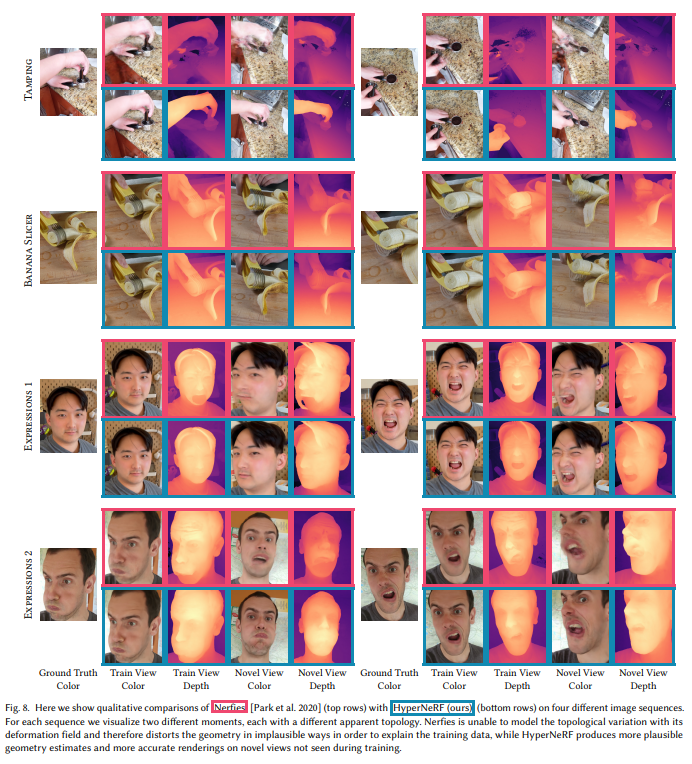 이 논문은 사진만 보아도 알 수 있듯이 Nerfies의 저자가 후속 연구로 진행한 것인데, NeRF를 확장하여 deformable NeRF를 (Nerfies 보다) 더 잘 만드는 논문이다. 단순히 물체의 이동이나 자세 변화 정도를 커버하는 것이 아니라 topology가 변화하는 수준까지 커버하는 것을 목표로 했으며 논문에서 대표적 예시로 극심한 얼굴 표정 변화를 사용하여 그 결과를 보여준다. 일단 project page의 데모 영상들만 보아도 압도적인 퀄리티를 자랑하는 것을 볼 수 있는데 성능 하나는 확실한 방법인 것 같다.