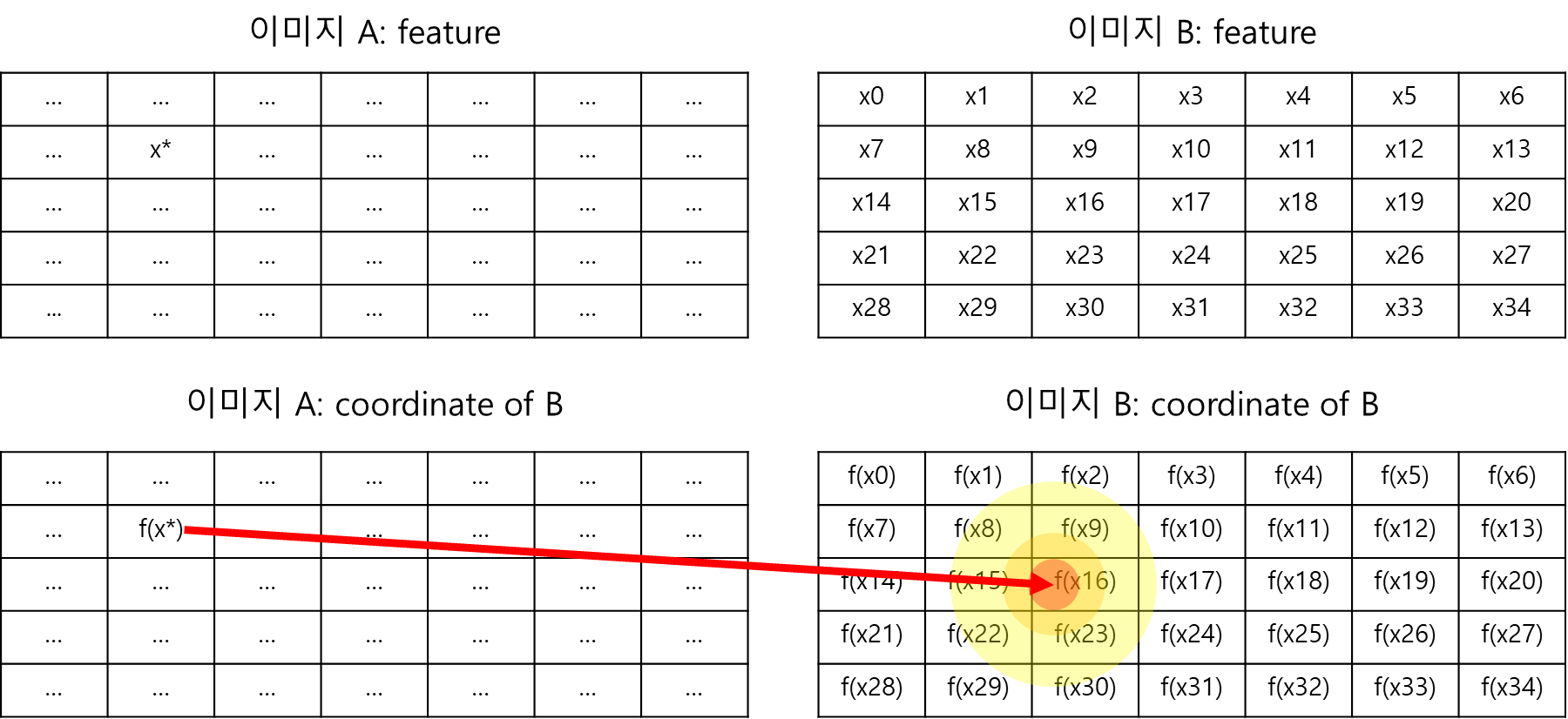 GP regression term에 일대일 대응을 시켜보면 이미지 B의 feature들이 N차원 값 x 이고 이미지 B의 coordinate가 f(x) (정확히는 f(x)의 관찰값 y)다.