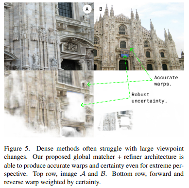 주요 특징점은 dense correspondence를 찾는 것을 목적으로 하면서, descriptor가 효율적이지 않다고 생각했는지 feature descriptor가 명시적을 존재하지 않는 형태로 디자인했고 늘어난 matching 수를 감당하기 위해 certainty 추정을 포함하도록 디자인했다.