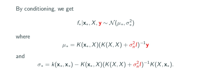 전개 과정을 생략하고 수학적으로 조금 점프를 한 뒤 결론부터 말하면, 위와 같이 갖고 있는 x <-> f(x) 쌍, X<-> f 를 갖고 mean* 와 std*를 계산하면 되는데 이 mean*와 std*가 새로운 x*가 주어졌을 때 확정될 확률 분포의 mean과 std다.