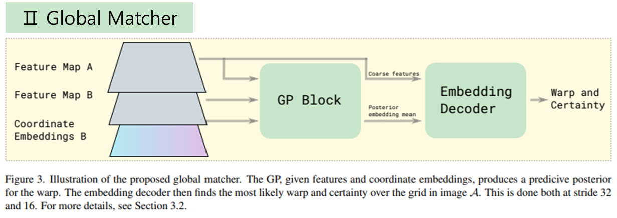 두번째 단계인 Global Matcher는 조금 복잡하다. 사실 복잡하다기 보다 dense matching 초기값을 계산하는데 그냥 단순히 앞서 나온 feature들의 유사도(similarity + argmin)를 계산하여 초기화하는 것이 아니라 GP (Gaussian process) regression을 이용하기 때문에 생소하다. 이미지 A의 픽셀이 이미지 B의 어떤 픽셀에 대응되는지 찾아내는 문제는 regression 문제로 간주할 수 있기 때문에 단순한 matching보다 regression method를 이용하는 편이 더 정확성을 높일 것이라고 기대한 듯하다.