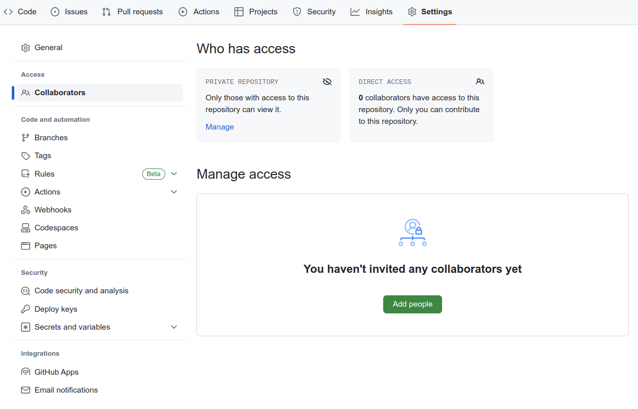 private repository - Settings - Collaborators - Manage access 에 들어가보면 본인 이름이 없는 것을 알 수 있다. 멤버 등록이 안되어 있으니 개인 token으로 만든 .netrc 파일을 넣어준다 한들 권한이 없는 것은 여전한 것이다.