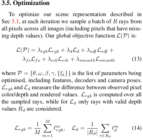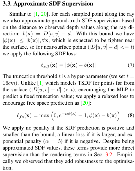 depth가 주어지기 때문에 (noisy하긴 하겠지만) 대충 SDF에도 직접 supervision이 가능하다. depth를 SDF로 변환해서 l1 loss를 걸어주는데 surfcae 초 근접 영역에서만 걸어준다. (room scale이라서 16cm 정도도 근접이라고 본 듯) depth의 noisy한 점을 완화하고 학습 불안정성을 낮추기 위해서 relaxed loss를 추가함 |