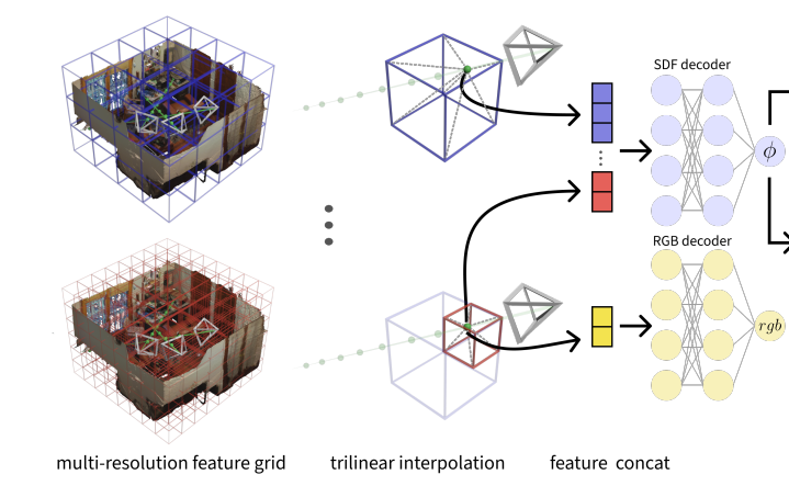 ![]() scene representation을 MLP만 쓴 것이 아니라 4레벨을 갖는 grid 와 MLP를 같이 썼다. MLP는 4레벨의 정보를 모아 1번 도는 형태로 shared MLP이다. 어떤 position, p가 주어지면 각 레벨 feature를 trilinear interpolation해서 concat한 뒤, MLP를 통과시킨다. color의 경우, 조금 다르게 finest 레벨 feature만 사용한다. |