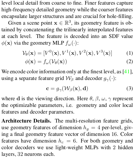 volume rendering 수식은 NeuS 수식을 그대로 가져왔다. loss term도 동일한 것을 사용했으며 차이점이라고 하면, NeuS는 color를 이용한 supervision만 가능했지만 입력에 depth가 포함되어 있기 때문에 같은 형태로 depth 를 이용한 supervision이 가능하다는 점이다. 그래서 color + depth rendering loss가 사용된다. |