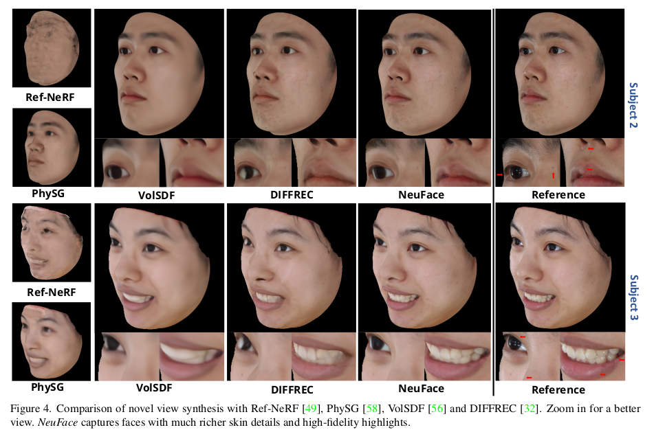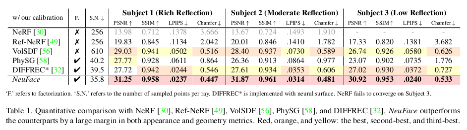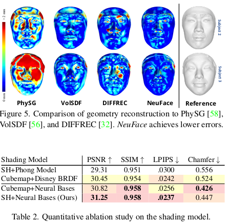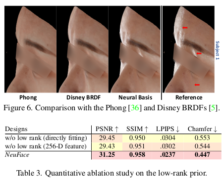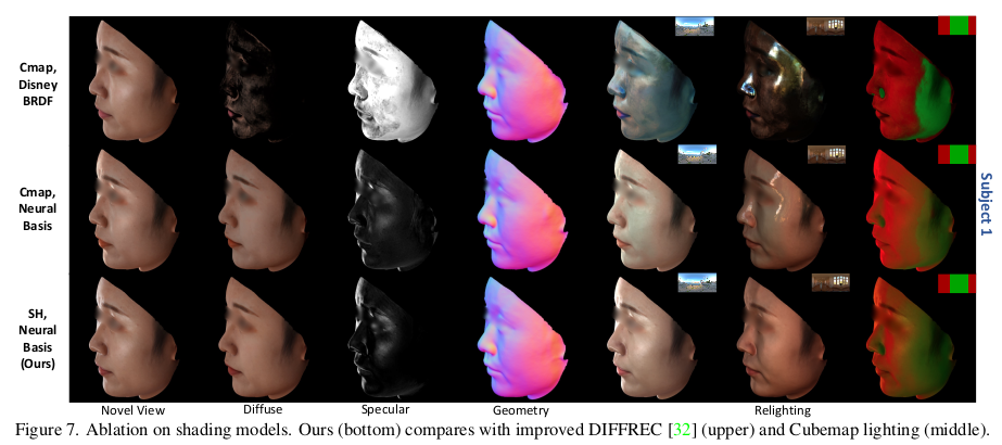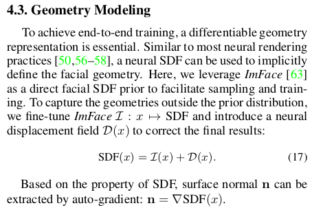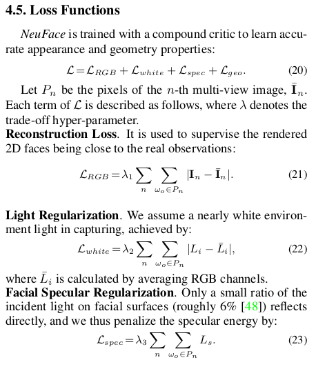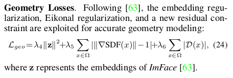 loss는 앞서 열심히 만든 diffuse term과 specular term에 해당하는 부분이다. volume rendering이니 color loss는 당연히 있다. geometry loss는 eikonal loss 그리고 ImFace에서 사용한 loss를 포함한다. D(x) loss는 residual이니 너무 크지 않도록 억제하는 기능이다. |