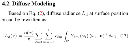 이젠 diffuse term인데 이전에 SH쓰고 split-sum approximation하고 이러쿵저러쿵 했을 때 수식(13)과 같이 정리되는데 여기서 시작한다. 여기서 integral은 구현 상 적합하지 않은 기호이므로 알 수 없는 approximation으로 한 번 더 줄여준다고 한다. (알 필요까진...) 그래서 수식(16)으로 최종정리해서 사용했다. |