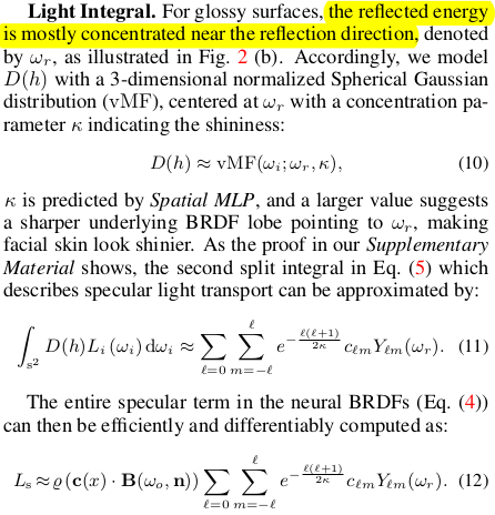 그림에서 (b)에 해당하는 내용으로 특정 방향으로 강하게 반사되는 specular를 표현하는 부분이다. glossy surface는 거울 반사처럼 입사각과 대칭인 방향 위주로 강하게 튕겨나가는 경향이 있기 때문에 3D normalized Spherical Gaussian distribution으로 모델링할 수 있다고 한다 (뭔소린지 모름. 그러나 대충 입사각과 대칭이 반사각을 기준으로 Gaussian 형태로 튕겨져 나간다는 가정이라고 이해했다.) 그리고 이 모델링을 구현하기 위해서 조금 증명과정으로 거치면 수식(12)까지 간다고 한다. (증명은 supplementary에 있다는데 안 봤다. 봐도 이해 못할 것 같아서) 이로써 specular term이 다 정리되었다. |