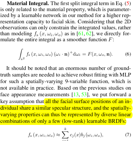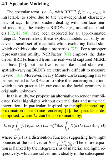 (glossy reflection이라더니 specular가 맞았다.) specular term을 어떻게 사용했는가? NeRO와 같은 형태다. specular BRDF는 split-sum 혹은 split-integral로 approximation하는 것이 일반적인가보다. 똑같이 수식(5)와 같이 approximation해서 쓴다. |