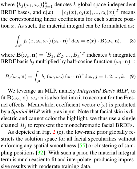 그림에서 (c)에 해당하는 표면으로 인한 불규칙 specular를 모델링하기 위한 내용이다. 수식(5)의 앞부분 integral에 해당한다. 반사각 일체에 대해서 integral해줌으로써 specular를 계산해야하지만 구현 상 이슈로 finite한 개수로 나누어 주어야 하므로 수식(7)과 같이 k개 반사각만 합치는 식으로 간소화했다. 최종적으로 수식 (6)은 수식 (8)로 정리된다. 여기서 BRDF bases, b도 learnable 이기 때문에 예측을 해주어야 하는데 이것은 Integrated Basis MLP를 붙여서 예측한다. 반사각을 입력으로 받아 이에 맞는 basis function을 내어주는 MLP다. |