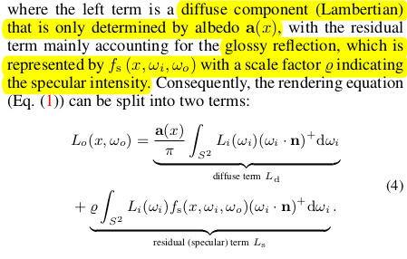 사전 배경지식으로, 빛 하나 하나를 보았을 때 BRDF로 모델링한다. 입사하는 빛의 각도에 따라 incident radiance, Li()를 계산해주어야 하는데 이건 수식(2)와 같이 Spherical harmonics + learnable coefficient 조합으로 표현된다고 정의해서 사용한다. BRDF, f 자체는 diffuse와 glossy reflection으로 정의했다. 사실 상 뒤에 붙은 glossy reflection은 specular term 역할이라고 보인다. |