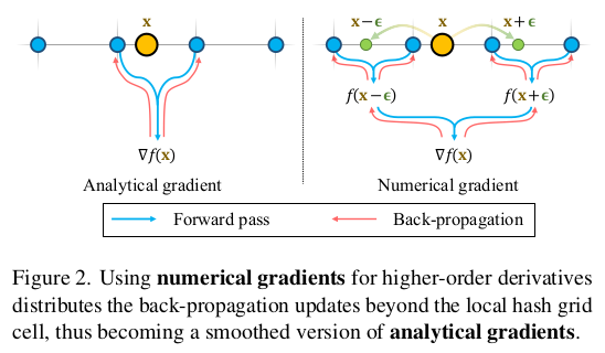 그리고 (잘은 모르겠지만) hash encoding을 사용하게 되면 trilinear interpolation을 하더라도 local grid cell에만 제한된다. (구조 상 옆 voxel grid와도 맞아떨어지도록 interpolation하기 어렵고 지금 대상으로 보고 있는 voxel에서만 interpolation된다는 뜻 같다.) ![]() 그래서 이를 해결하고자, 특정 step size epsilon을 정의하고 이것을 이용해서 numerical gradient를 만들었다. 옆 voxel의 analytical 값들을 interpolation해서 현 voxel 값을 강제로 만드는 것이다. 일반적인 volume trilinear interpolation하면 이게 당연한 소리 같지만 hash encoding에서는 이게 안통하는 개념인가보다 강제로 locality를 넘어서서 trilinear interpolation 효과를 만들고 gradient를 수식(8)과 같이 만들어서 썼다. |