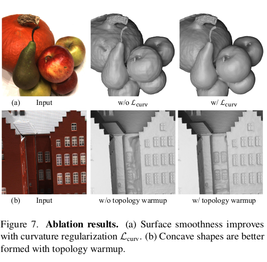 loss는 기존 논문들과 완전 동일하게 color loss, eikonal loss가 주축이다. 독특하게도 curvature loss라고 SDF의 2차 미분 값을 0으로 보내는 loss를 설계했다. (그럼 backward는 triple backward인데... 직접 구현한 것 같다.) |