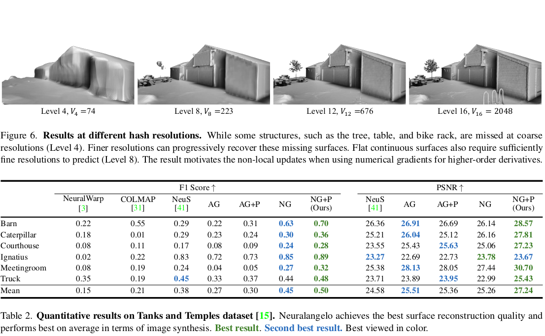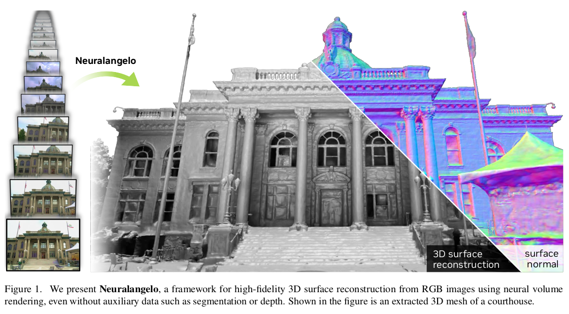 이 논문은 한마디로 Instant NGP의 SDF 버전 논문이다. Instant NGP는 view synthesis용으로 NeRF 첫 논문의 초 가속화 버전 논문이었는데 이를 3D reconstruction에 특화된 NeRF로 확장하는 논문이다. 핵심적인 내용은 hash encoding 기법을 2nd order derivate 계산에 적용한 것이다. 모든 3D surface reconstruction NeRF들이 속도 문제로 고생할 때 벽처럼 다가오는 것이 2nd order derivate 계산이 기능적으로 지원되지 않았던 점이다. surface reconstruction에 코어인 normal과 eikonal loss를 사용할 수 없기 때문이다. hash encoding 기법으로 2nd order derivate도 커버할 수 있도록 수정하여 속도와 성능을 둘 다 잡는 논문이라고 할 수 있겠다.