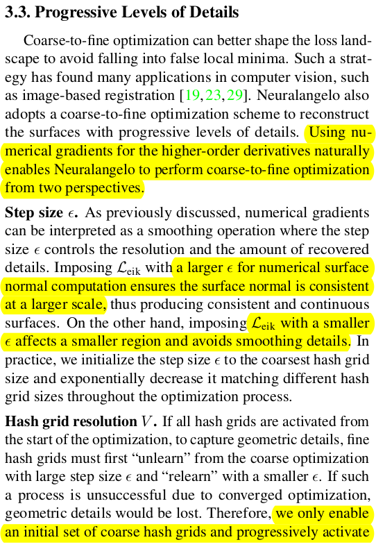 numerical gradients를 사용하게 되면서 step size라는 파라미터가 생겼고 필연적으로 coarse-to-fine으로 학습하는 방식을 사용하게 되었다. step size가 클 땐 global하게, step size가 작을 땐 local하게 interpolation이 될테니 말이다. 또한 hash grid 구조 상 여러 level이 존재하는데 step size에 맞추어 level을 나누어 순차적으로 학습되게 함으로써 효율을 확보할 수도 있다고 한다. |